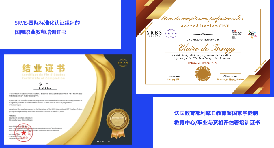 基于 SRVE-国际职业教育标准,SRVE-国际标准化组织与法国职业资格评估署(Campus des Métiers et des Qualifications ), 法国利摩日国家学徒制教育中心(CFA Academique du Limousin)联合研发出“基于欧洲职业教育标准的中文+职业教育技能模块教学方法”系列课程。